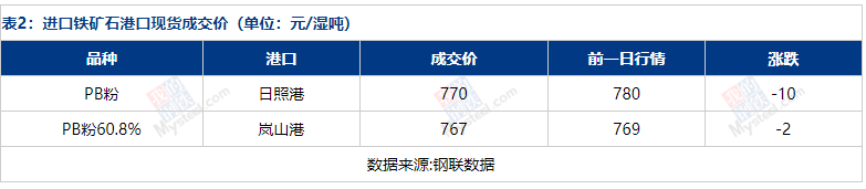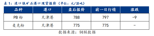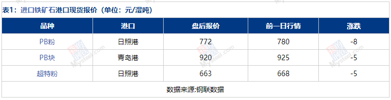 今日西南進口鐵礦石現(xiàn)貨市場價格小幅下跌,今日暫無成交。具體來看,賣盤方面,行情影響下,今日貿(mào)易商報價積極性一般,報價隨行就市為主;買盤方面,鋼廠詢盤一般。鋼廠整體持觀望態(tài)度。表1:進口鐵礦石港口現(xiàn)貨報價(單位:元/濕噸)
