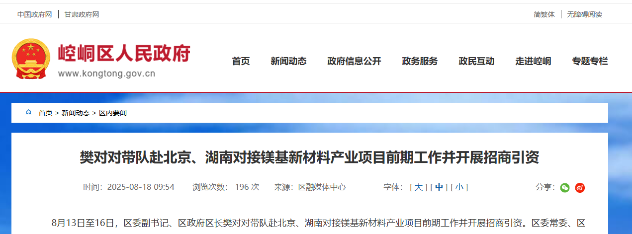 近日,崆峒區(qū)區(qū)委副書記、區(qū)政府區(qū)長(zhǎng)樊對(duì)對(duì)帶隊(duì)赴北京、湖南對(duì)接鎂基新材料產(chǎn)業(yè)項(xiàng)目前期工作并開展招商引資。崆峒區(qū)區(qū)委常委、區(qū)政府常務(wù)副區(qū)長(zhǎng)郭凱參加。